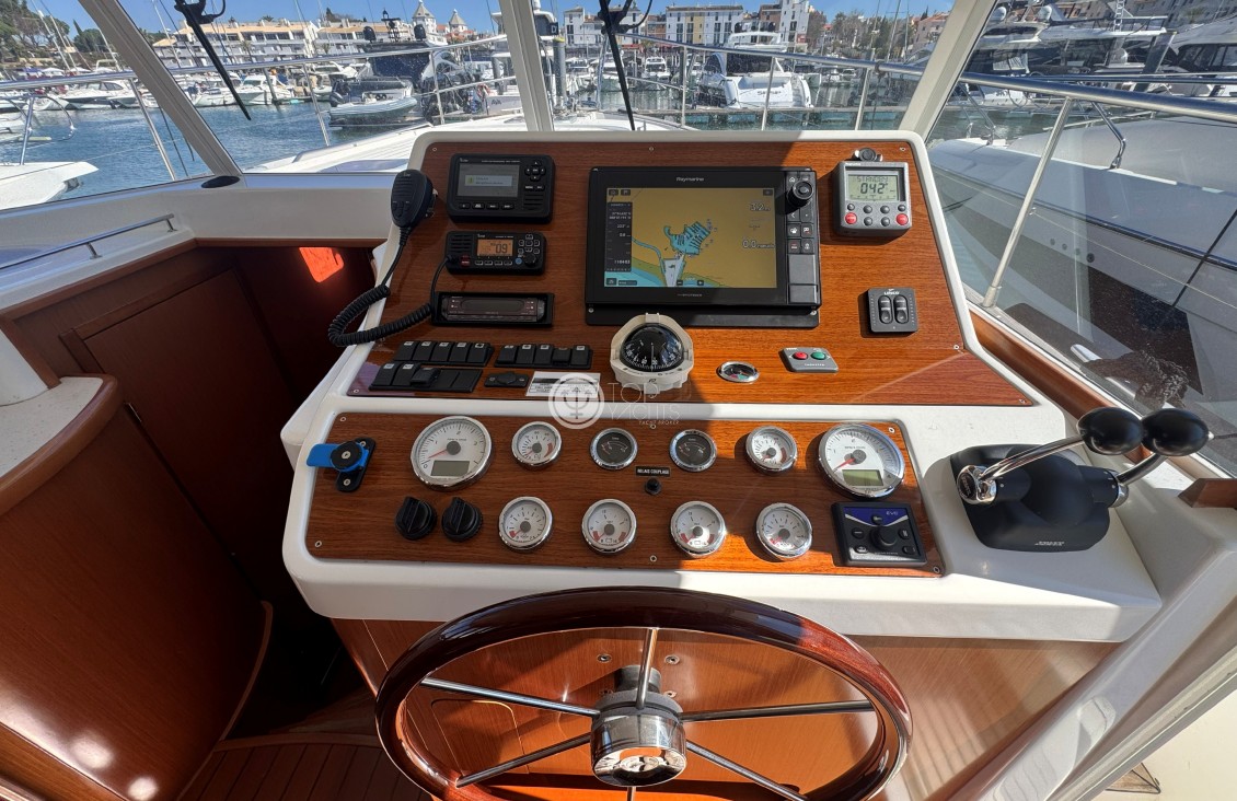 Cockpit espaçoso com acabamento em teca, ideal para convívio