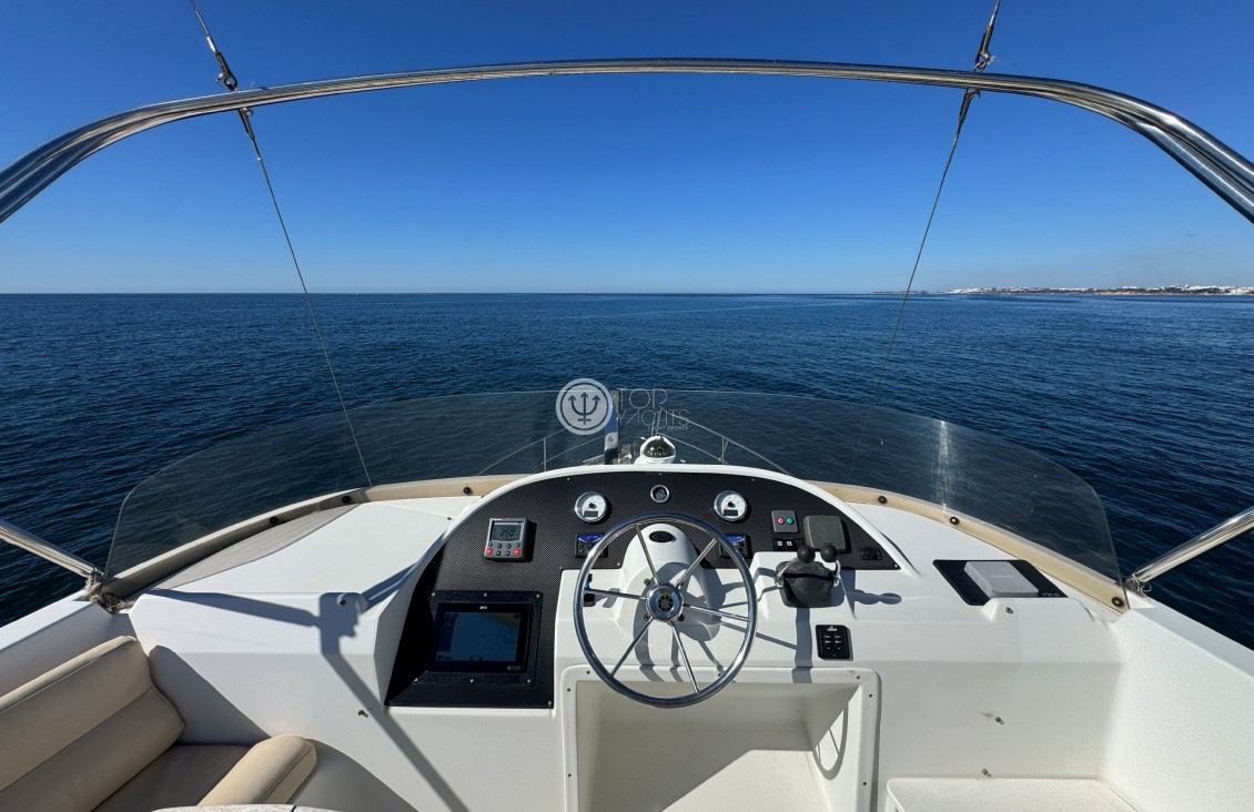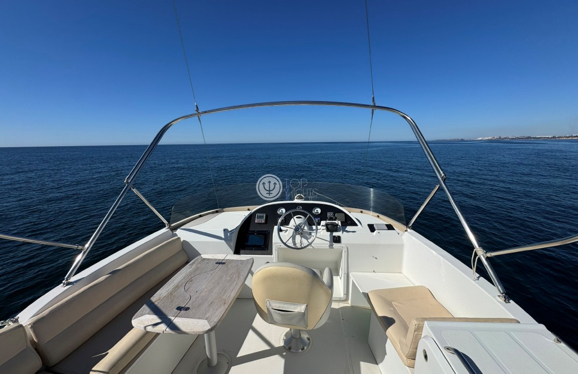 Flybridge amplo com zona de comando, assentos e excelente visibilidade